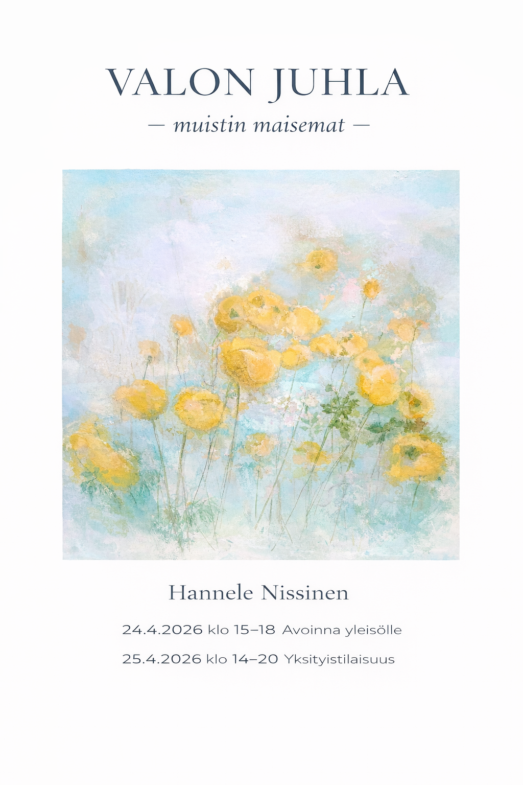 Tervetuloa popup-näyttelyyn, jossa pohjoinen maisema, sukupolvien jatkumo ja rakkaus Lappiin kohtaavat. Esillä on teoksia, joiden juuret ulottuvat Kittilän Rautuskylään ja Torniojoen virtaan. Näyttelyn sydämenä nähdään äitini kulleromaalaus 1970-luvulta, jonka rinnalla omat tulkintani, teemat ja variaatiot, etsivät tietään kotiin.