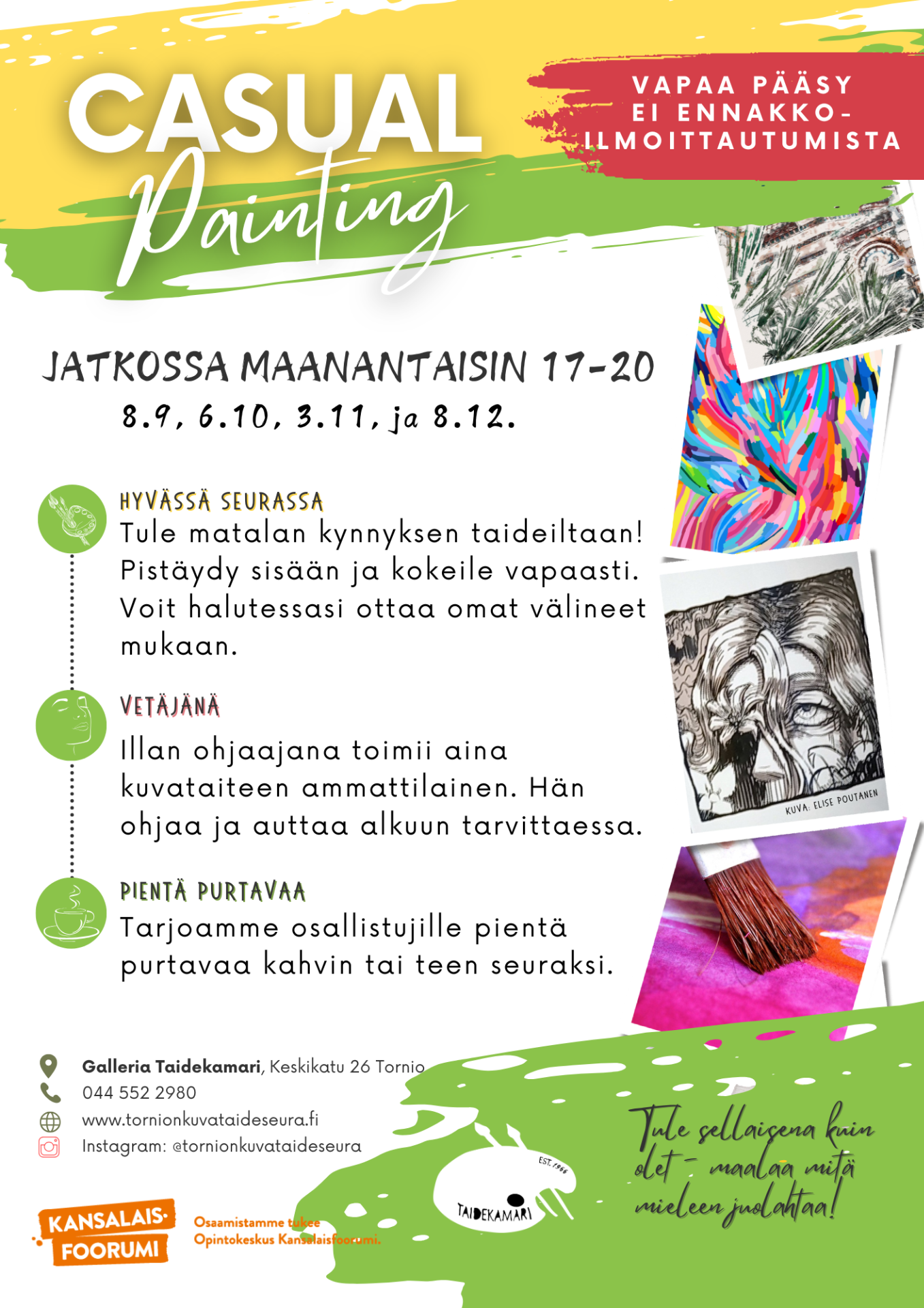 Casual Painting-illat järjestetään syksyllä 2025 aikana 4 kertaa maanantaisin klo 17-20 Galleria Taidekamarilla, Keskikatu 26.