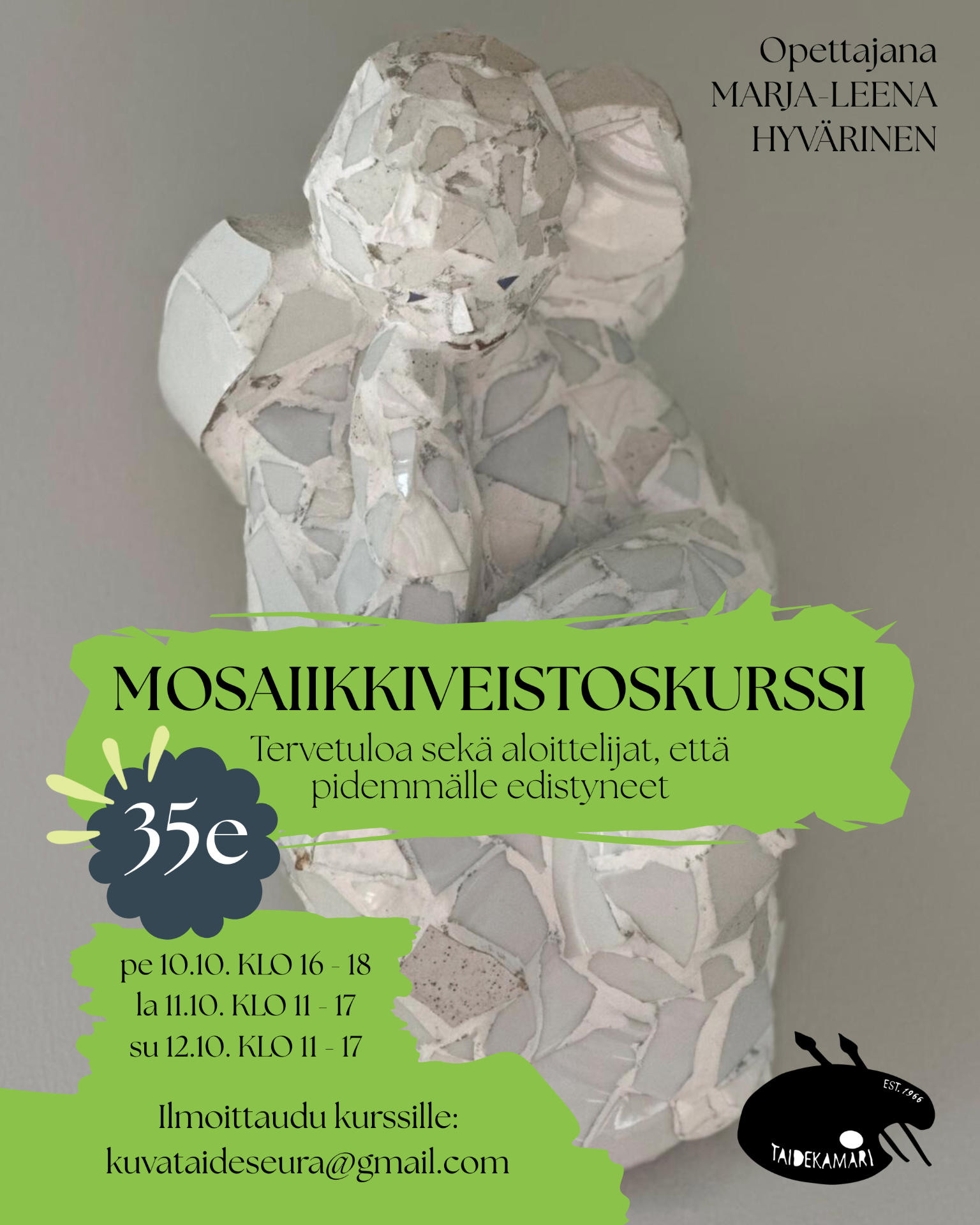 Materiaalit: Kuvataideseura tarjoaa pääasiassa kurssilla tarvittavat materiaalit, mutta kehotamme tuomaan omia mieleisiä keramiikkaesineitä mukanasi. Usein kotoa löytyy tarpeettomia ja rikkinäisiä keramiikkaesineitä, mutta niitä saa myös halvalla esimerkiksi kirpputoreilta.