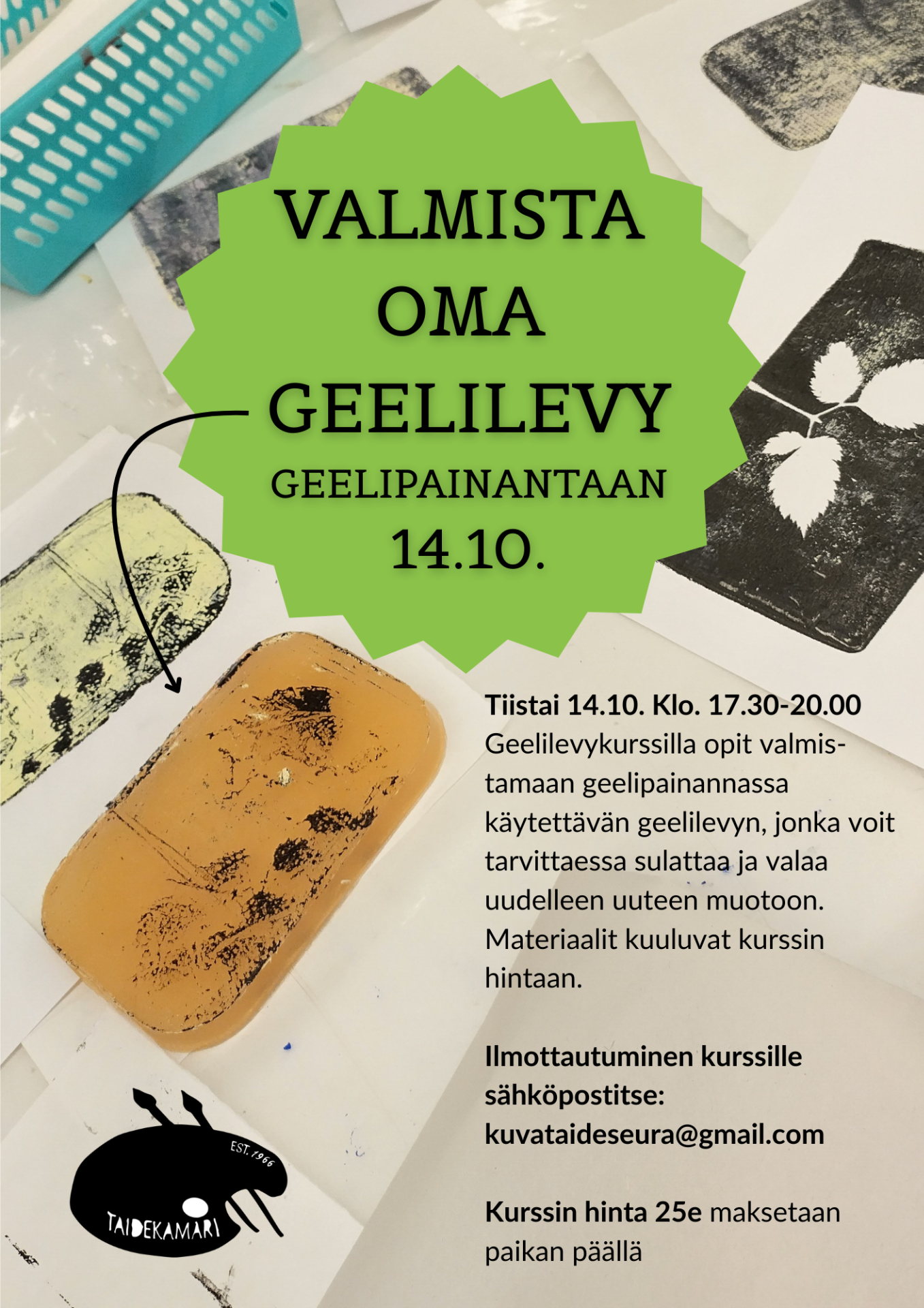 Kurssilla valmistetaan oma geelilevy painantaa varten. Materiaalit yhden 20x20 levyn valmistukseen kuuluvat kurssin hintaan. Jos haluat tehdä useamman tai suuremman geelilevyn, sovi asiasta kurssin vetäjän kanssa kurssin alussa. Voit kokeilla valmistamaasi gelilevyä myöhemmin esimerkiksi casual painting tai paint&wine -illoissa.